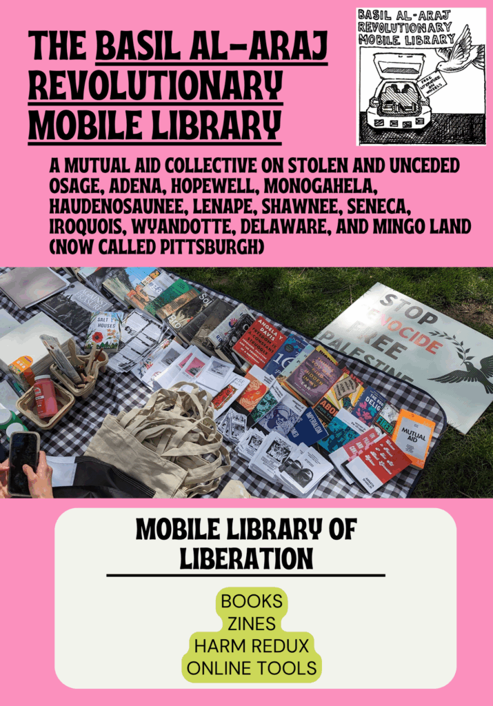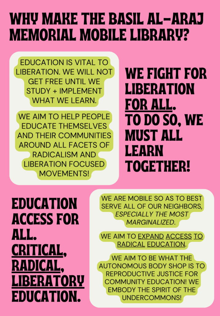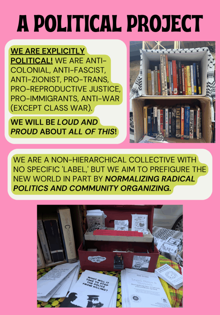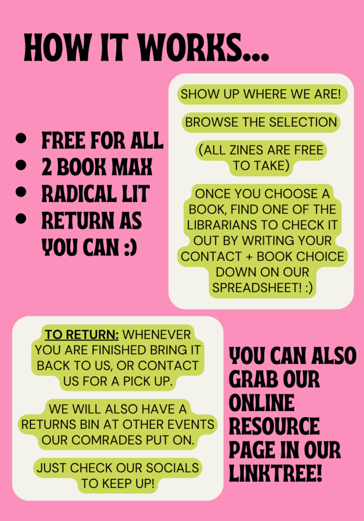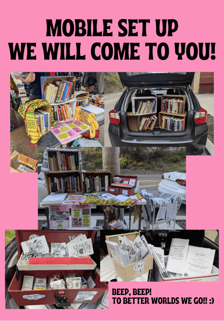 The mobile library existed before us. We were inspired by those in Atlanta (https://www.refaatlibrary.com/) and NYC (https://thenonbinarian.gay/). As individuals coming together we realized we had all imagined some formation of this project in recent years. We wanted to be able to situate this as part of a larger organizing, not an individual project, and this needed more defining. We had to connect education, underground/mutual aid networks away from the existing, and building new infrastructure for ourselves.