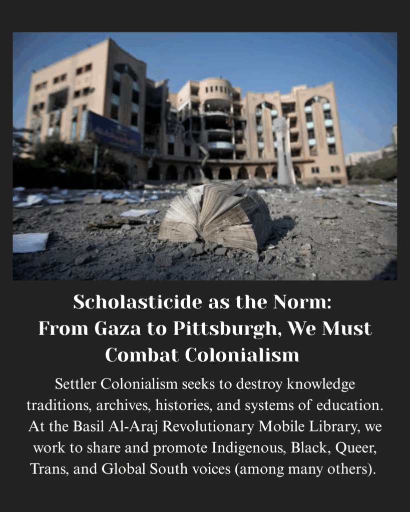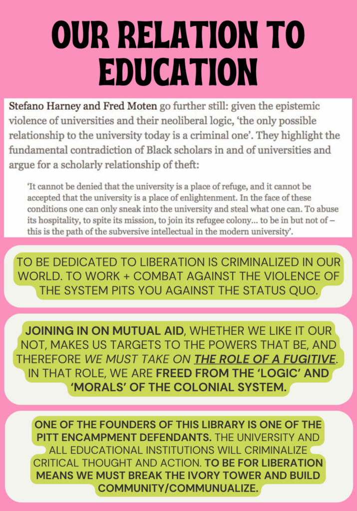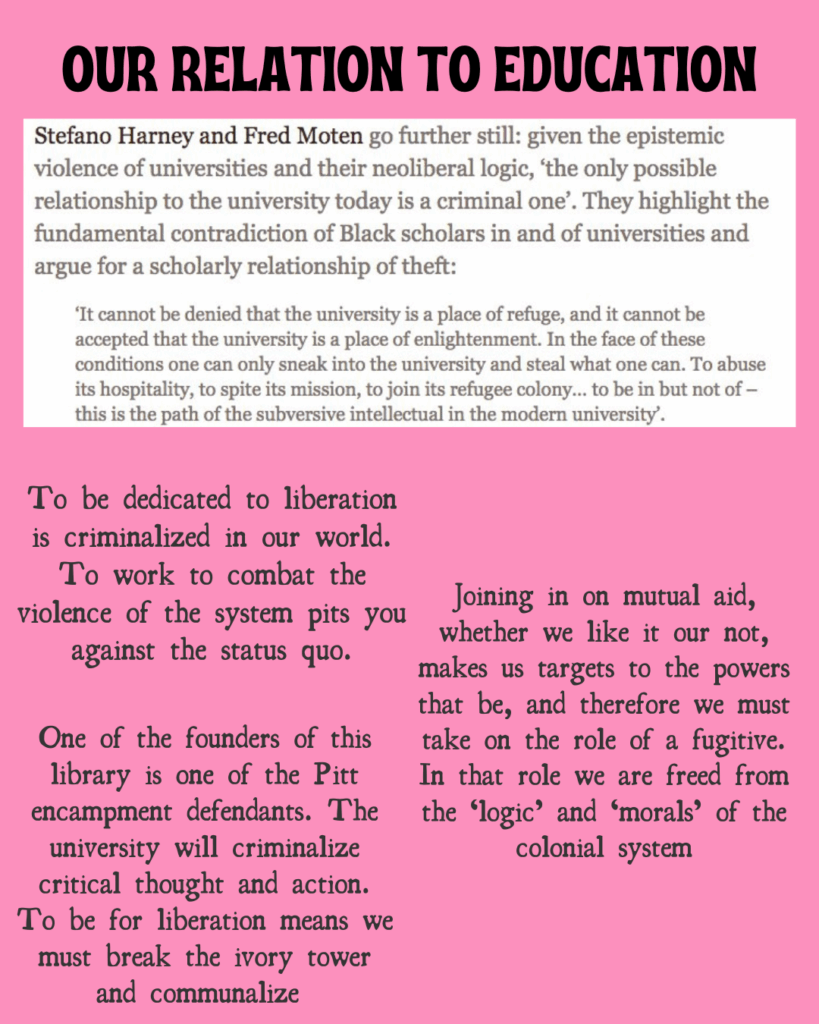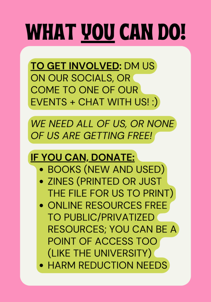 The mobile library existed before us. We were inspired by those in Atlanta (https://www.refaatlibrary.com/) and NYC (https://thenonbinarian.gay/). As individuals coming together we realized we had all imagined some formation of this project in recent years. We wanted to be able to situate this as part of a larger organizing, not an individual project, and this needed more defining. We had to connect education, underground/mutual aid networks away from the existing, and building new infrastructure for ourselves.