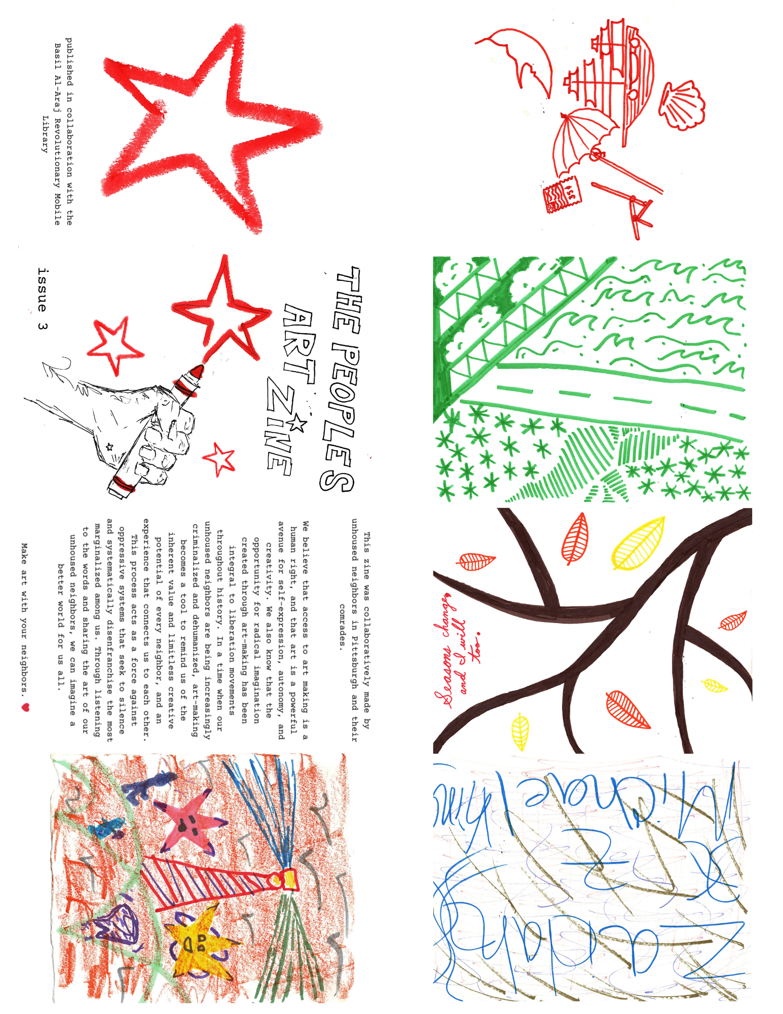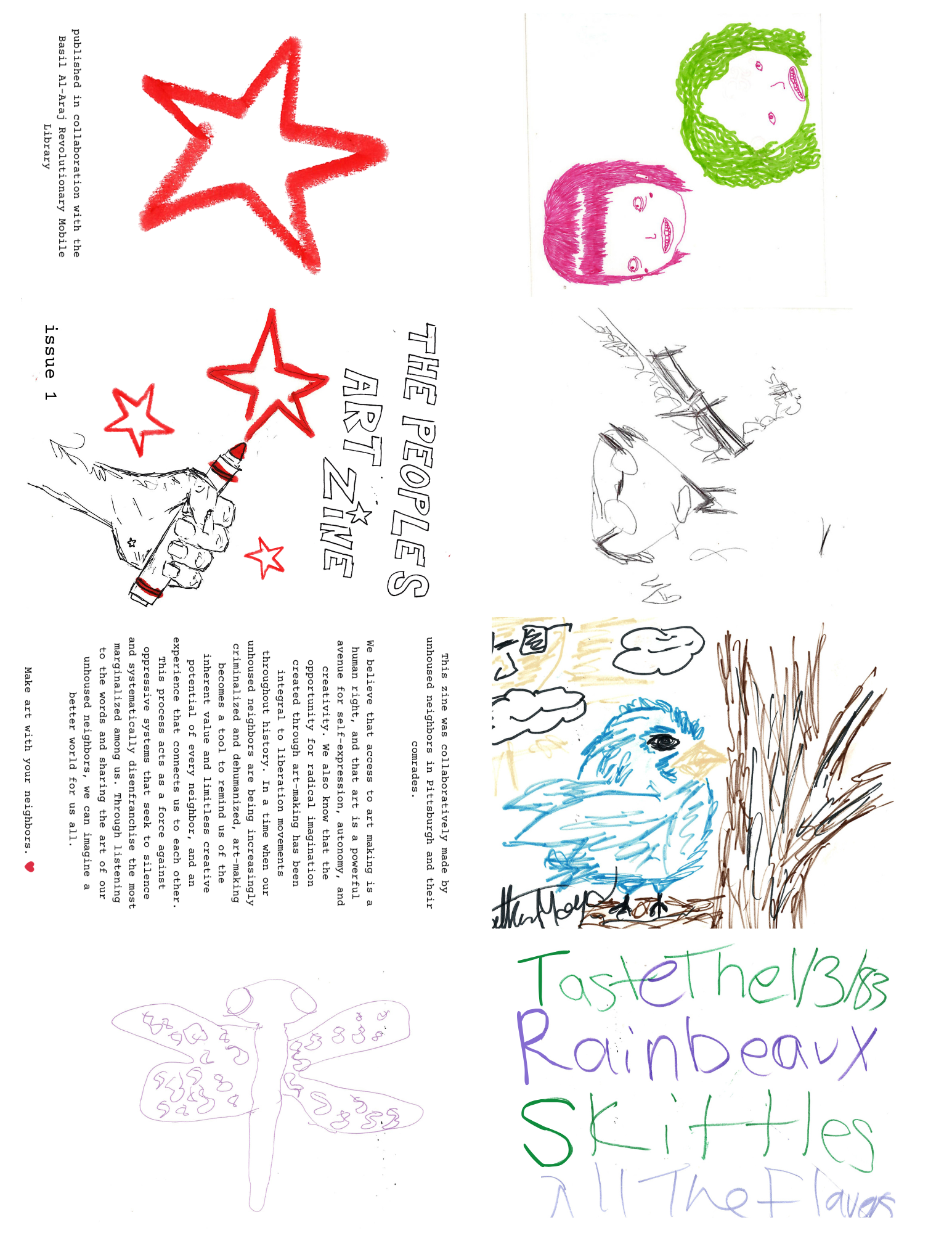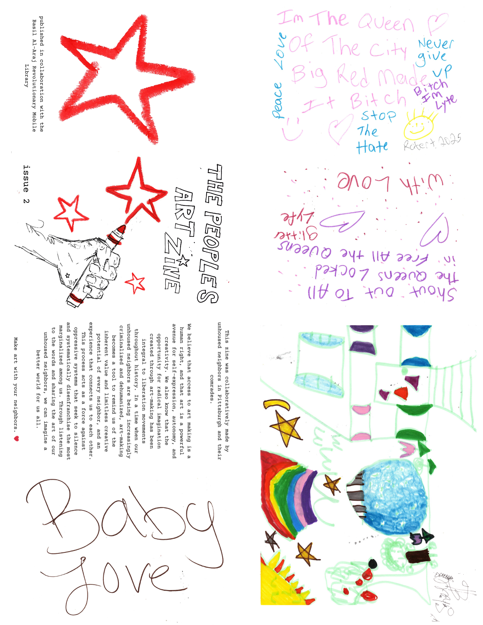 Along with traditional library materials, we have been bringing art supplies to local distros, encouraging folks to sit down, be in each others’ company, and engage in creative self expression. These zines feature art made by community members and comrades from May 2025-present.