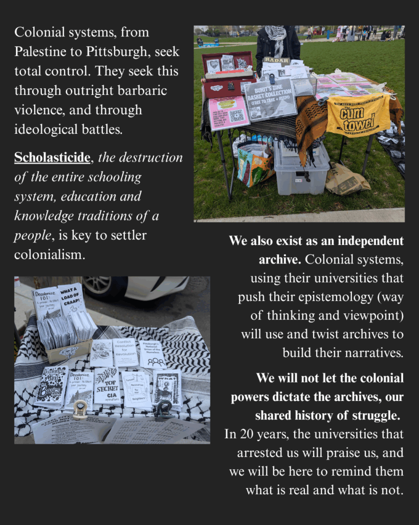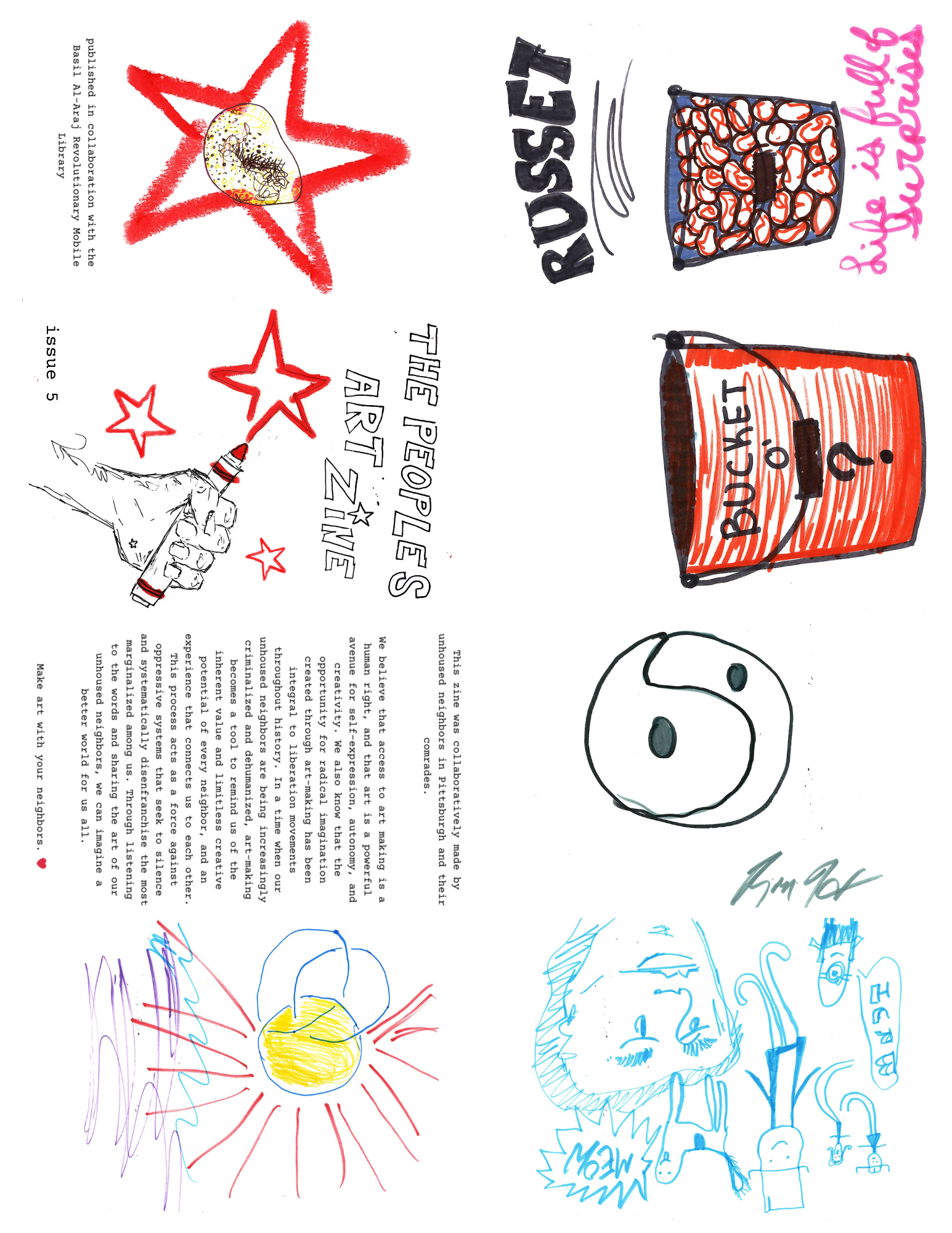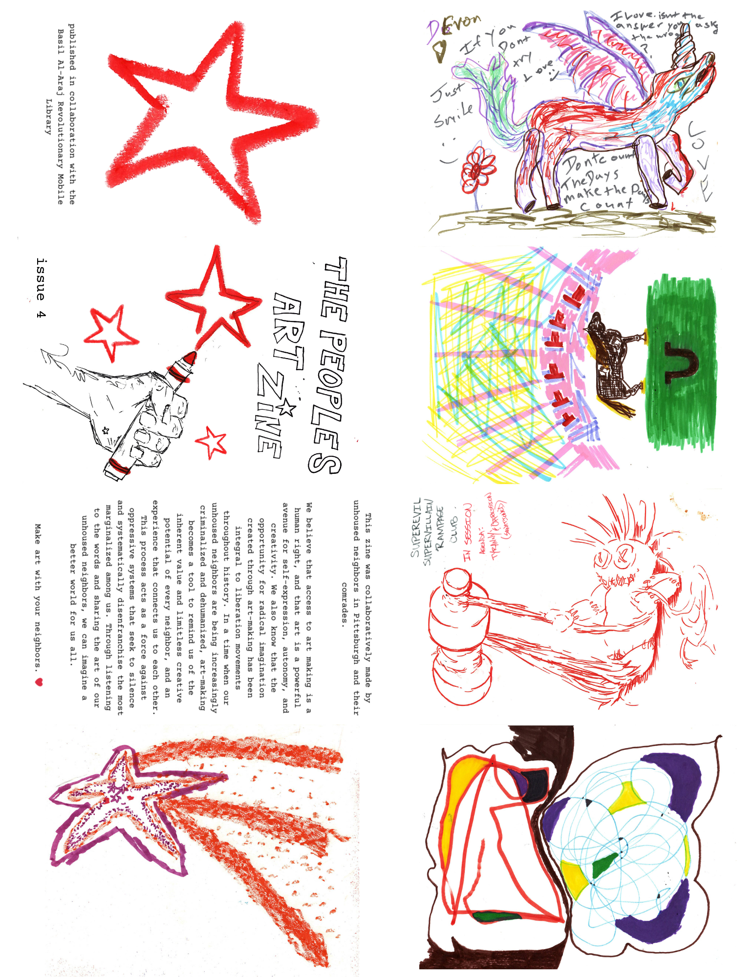 Along with traditional library materials, we have been bringing art supplies to local distros, encouraging folks to sit down, be in each others’ company, and engage in creative self expression. These zines feature art made by community members and comrades from May 2025-present.
